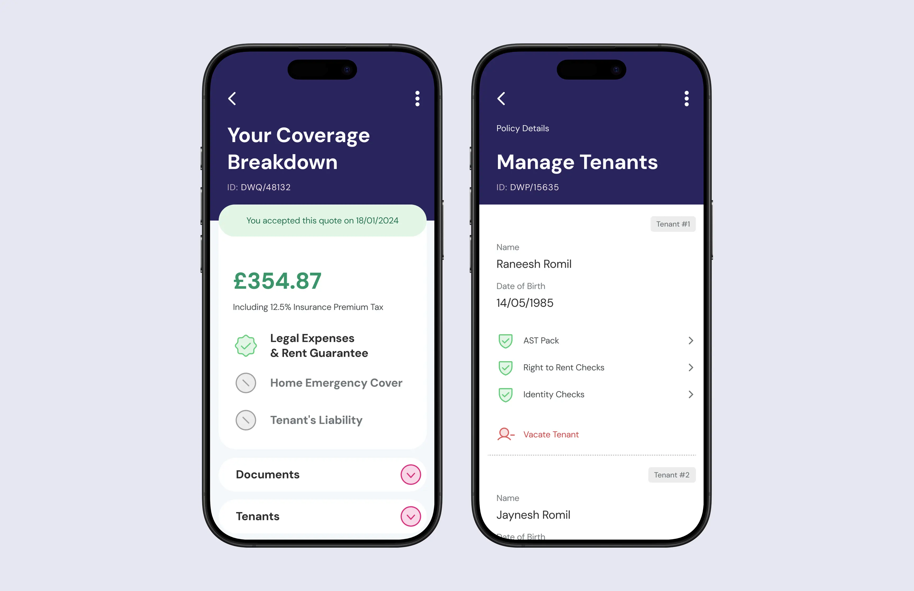 Dwello is a self-service portal that takes landlords from initial quote to active policy in a single session. They answer a series of questions about their property, receive a price, pay by card, and download their documents immediately.